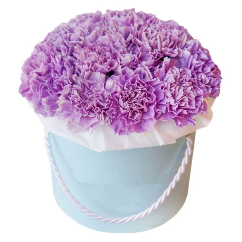 Букет состоит из 25 сиреневых гвоздик, коробка, оазис.