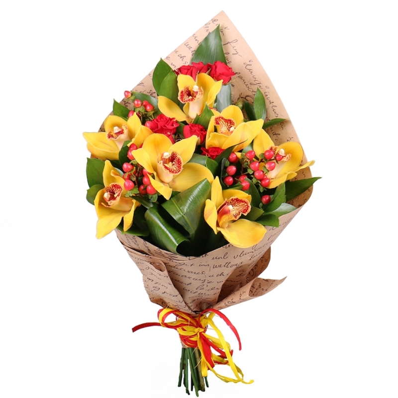 Букет состоит из 7 желтых орхидей, 2 ветки кустовой розы, 3 гиперикум, аспидистра, крафт, атласная лента.