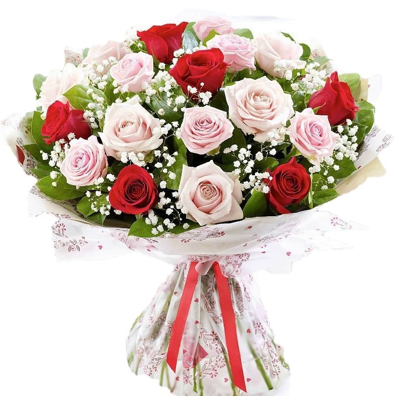Букет состоит из 14 розовых роз, 7 красных роз, 2 ветки гипсофилы, красивая упаковка, атласная лента.