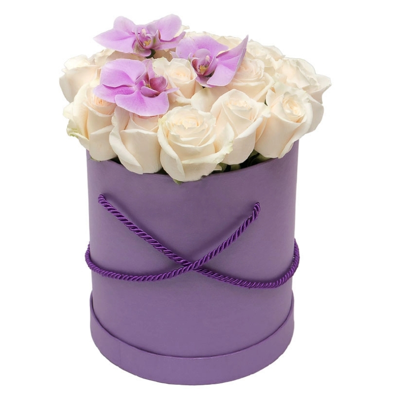 Букет состоит из 21 роза, 3 орхидеи, коробка, оазис.