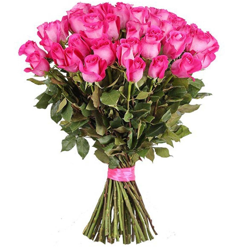 Букет состоит из 35 малиновых роз, прозрачная упаковка, атласная лента.