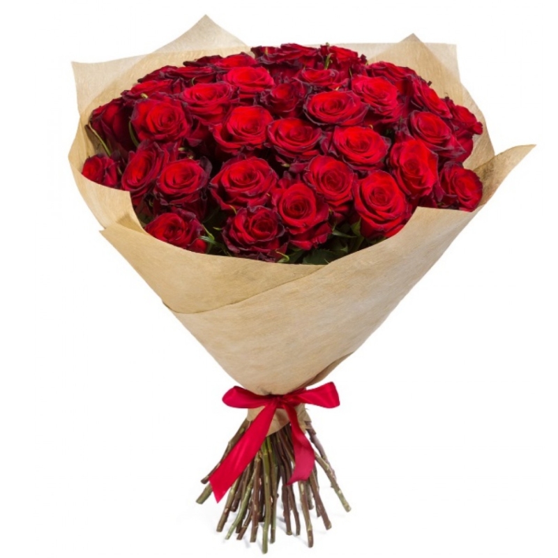 Букет состоит из 31 красная роза, крафт, атласная лента.